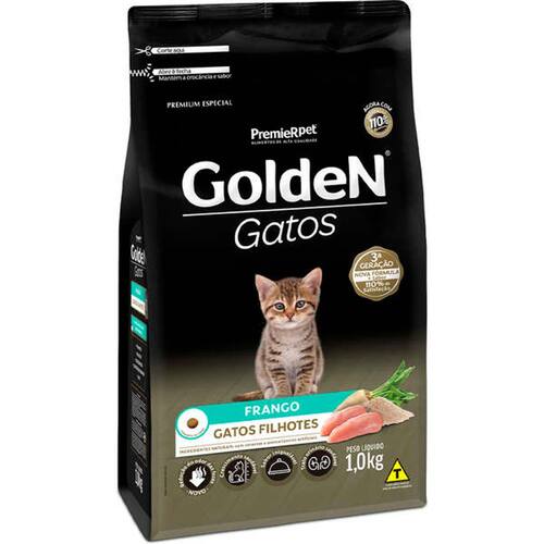 Racao Golden Gatos Filhotes Frango . 1kg. Sabor inigualavel: maxima satisfacao para o paladar; . Trato urinario saudavel: minerais balanceados e controle do pH urinario; . Crescimento saudavel: atraves de otimos niveis de proteinas, taurina e DHA; . Reducao do odor das fezes: selecao de ingredientes especiais que auxiliam na reducao do odor das fezes.