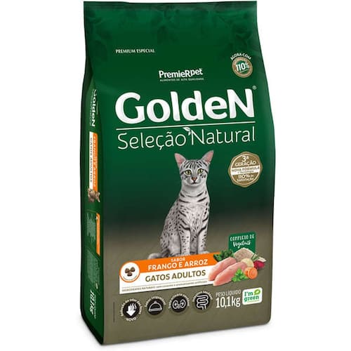 Golden Selecao Natural Gatos Adultos 10,1 Kg. Sabor inigualavel: maxima satisfacao para o paladar;. Trato urinario saudavel: minerais balanceados e controle do pH urinario;. Intestino saudavel: combinacao de ingredientes de alta digestibilidade e prebioticos;. Reducao do odor das fezes: selecao de ingredientes especiais que auxiliam na reducao do odor das fezes.A Racao Seca PremieR Pet Golden Selecao Natural para Gatos Adultos contem complexo de 6 vegetais, como fonte de fibras e sais minerais, baixo teor de sodio para ressaltar o sabor natural dos ingredientes, sem corantes e aromatizantes artificiais e sem ingredientes transgenicos, a linha Golden Selecao Natural e a melhor escolha para que seu pet tenha uma alimentacao de acordo com seu estilo de vida.