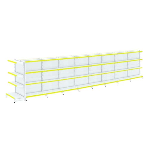 A Gôndola FIT 40 FARMA Centro é ideal para farmácia, supermercados, mercearias, lojas de utilidades, materiais de construção, agropecuárias e outros. Devido sua altura permite uma visão ampla central do comércio.