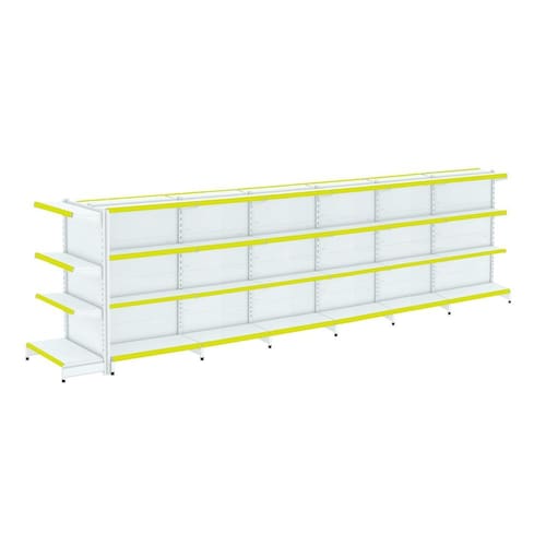KIT GÔNDOLA CENTRO 137 FIT AMAPÁ 40/30 BRANCO PARA VÃO DE ATÉ 6,30 METROS COM UMA PONTA 52 BANDEJAS PORTA ETIQUETA AMARELO