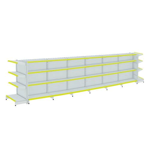 KIT GÔNDOLA CENTRO 137 FIT AMAPÁ 40/30 BRANCO PARA VÃO DE ATÉ 6,70 METROS COM DUAS PONTAS 56 BANDEJAS PORTA ETIQUETA AMARELO