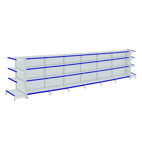 KIT GÔNDOLA CENTRO 137 FIT AMAPÁ 40/30 BRANCO PARA VÃO DE ATÉ 6,70 METROS COM DUAS PONTAS 56 BANDEJAS PORTA ETIQUETA AZUL