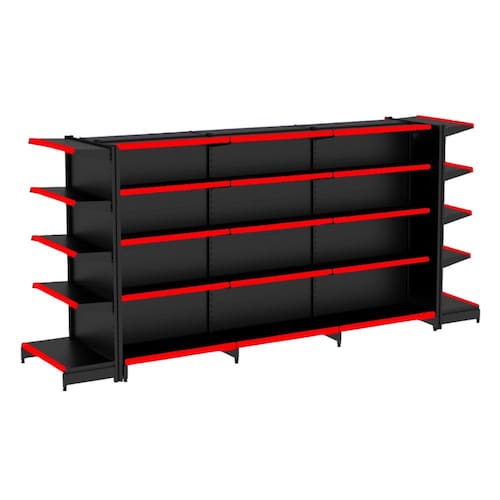 KIT GÔNDOLA CENTRO 170 FIT AMAPÁ 40/30 PRETO PARA VÃO DE ATÉ 3,80 METROS COM DUAS PONTAS 40 BANDEJAS PORTA ETIQUETA VERMELHO