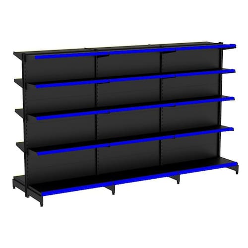 KIT GÔNDOLA CENTRO 170 FIT AMAPÁ 40/30 PRETO PARA VÃO DE ATÉ 3 METROS 30 BANDEJAS PORTA ETIQUETA AZUL