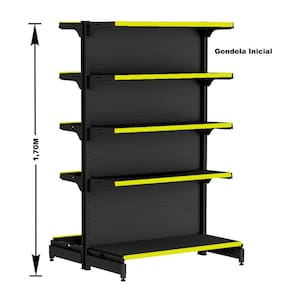 KIT GÔNDOLA CENTRO 170 FIT AMAPÁ 40/30 PRETO PARA VÃO DE ATÉ 5,3 METROS COM UMA PONTA 55 BANDEJAS PORTA ETIQUETA AMARELO