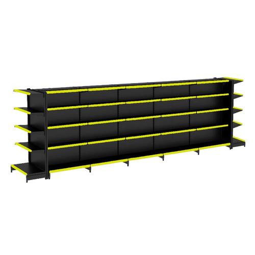 KIT GÔNDOLA CENTRO 170 FIT AMAPÁ 40/30 PRETO PARA VÃO DE ATÉ 5,70 METROS COM DUAS PONTAS 60 BANDEJAS PORTA ETIQUETA AMARELO