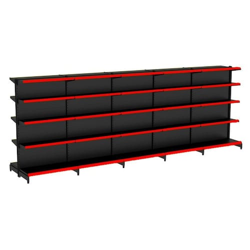 KIT GÔNDOLA CENTRO 170 FIT AMAPÁ 40/30 PRETO PARA VÃO DE ATÉ 4,9 METROS 50 BANDEJAS PORTA ETIQUETA VERMELHO
