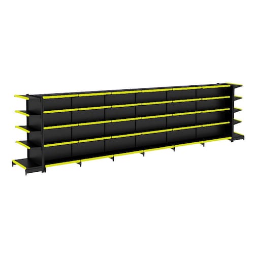 KIT GÔNDOLA CENTRO 170 FIT AMAPÁ 40/30 PRETO PARA VÃO DE ATÉ 6,70 METROS COM DUAS PONTAS 70 BANDEJAS PORTA ETIQUETA AMARELO