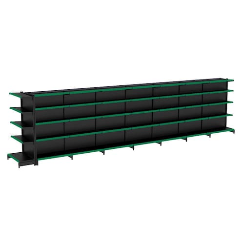 KIT GÔNDOLA CENTRO 170 FIT AMAPÁ 40/30 PRETO PARA VÃO DE ATÉ 7,3 METROS COM UMA PONTA 75 BANDEJAS PORTA ETIQUETA VERDE