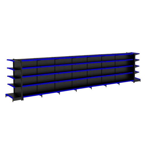 KIT GÔNDOLA CENTRO 170 FIT AMAPÁ 40/30 PRETO PARA VÃO DE ATÉ 7,70 METROS COM DUAS PONTAS 80 BANDEJAS PORTA ETIQUETA AZUL