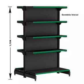 KIT GÔNDOLA CENTRO 170 FIT AMAPÁ 40/30 PRETO PARA VÃO DE ATÉ 6,7 METROS 70 BANDEJAS PORTA ETIQUETA VERDEPara garantir uma configuração adequada, inicie a fileira com a Gôndola Inicial de 2 colunas, seguida pela Gôndola Continuação de 1 coluna, essencial para manter a continuidade da disposição e que não pode ser montada separadamente.Gôndola Fit 40 é a escolha perfeita para uma variedade de estabelecimentos, desde supermercados e mercearias até lojas de utilidades, materiais de construção e agropecuárias. Sua adaptabilidade a diferentes tipos de produtos e ambientes faz dela uma solução indispensável para organizar e exibir mercadorias de forma eficiente.Prática e fácil de montar, com sistema de encaixe sem utilização de parafusos, inclinação da bandeja em 3 posições, possui bandejas reguláveis na coluna a cada 25 mm, o que permite adição de bandejas extras. Sistema de reforço que permite maior capacidade de carga.ESPECIFICAÇÕES:Inclinação da bandeja em 3 posiçõesCapacidade por bandeja: 40 Kg distribuídoA bandeja base com profundidade de 40 cm e as demais 30 cmPorta etiqueta nivelado com a bandejaReforço na base da bandejaCOMPOSIÇÃO:1 Gôndola Fit inicial Centro6 Gôndola Fit Continuação CentroDIMENSÕES (AxLxP):Altura: 170,0 cmLargura: 6,54 mProfundidade: 80,0 cmDÚVIDAS FREQUENTES:Qual a finalidade dessa gôndola e indicação? Posso aumentar o número de bandejas?Esta solução simplifica a exposição de produtos. Além disso, oferece a flexibilidade de aumentar o número de bandejas, opcionalmente, reduzindo o espaço entre elas para otimizar o aproveitamento do espaço disponível.Qual o material?Resposta: Chapa de aço.Qual a resistência das bandejas?Resposta: A linha Fit 40 tem reforço ômega e permite adicionar até 40 kg por bandeja desde que seja distribuído.