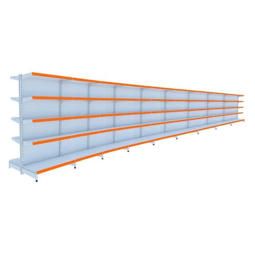 KIT GÔNDOLA CENTRO 170 FIT AMAPÁ 40/30 BRANCO PARA VÃO DE ATÉ 8,7 METROS 90 BANDEJAS PORTA ETIQUETA LARANJA