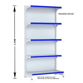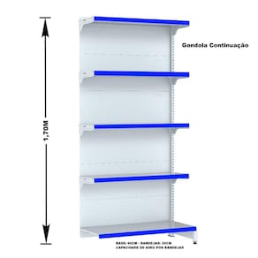 GONDOLA PAREDE 170 FIT AMAPÁ PARA VÃO DE ATÉ 4 METROS MAIS UM CANTO 40/30 BRANCO 25 BANDEJAS PORTA ETIQUETA AZUL