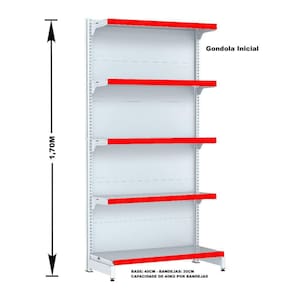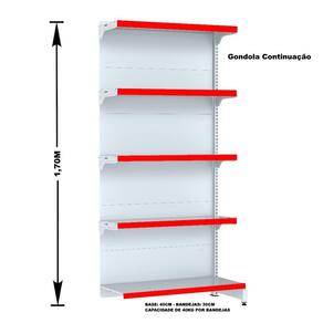 GONDOLA PAREDE 170 FIT AMAPÁ PARA VÃO DE ATÉ 4 METROS MAIS UM CANTO 40/30 BRANCO 25 BANDEJAS PORTA ETIQUETA VERMELHO