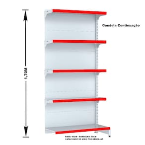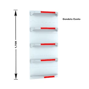 GONDOLA PAREDE 170 FIT AMAPÁ PARA VÃO DE ATÉ 5 METROS MAIS UM CANTO 40/30 BRANCO 30 BANDEJAS PORTA ETIQUETA VERMELHO