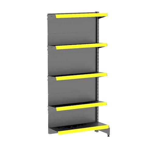 GÔNDOLA PAREDE 196 CONTINUAÇÃO AMAPÁ LINHA PREMIUM FLEX 60 EXTRA FORTE 5 BANDEJAS 1X 40 CM 4X 35 CM COR PRETO PORTA ETIQUETA (FAIXA) AMARELO