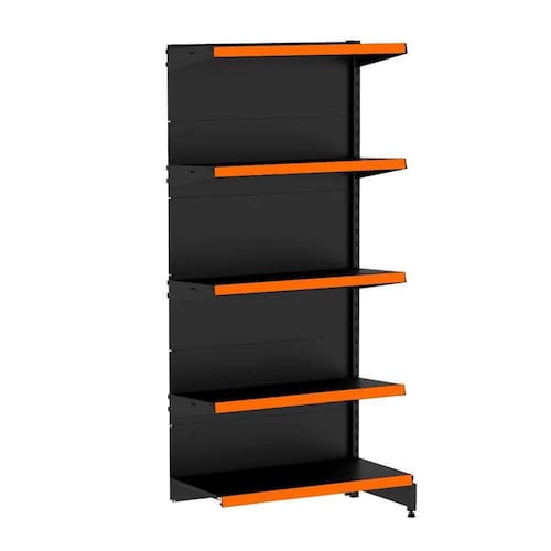 GÔNDOLA PAREDE 196 CONTINUAÇÃO AMAPÁ LINHA PREMIUM FLEX 60 EXTRA FORTE 5 BANDEJAS 1X 40 CM 4X 35 CM COR PRETO PORTA ETIQUETA (FAIXA) LARANJA
