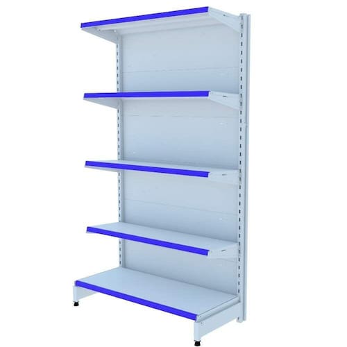 GÔNDOLA PAREDE 196 INICIAL AMAPÁ LINHA PREMIUM FLEX 60 EXTRA FORTE 5 BANDEJAS 1X 40 CM 4X 35 CM COR BRANCO PORTA ETIQUETA (FAIXA) AZUL