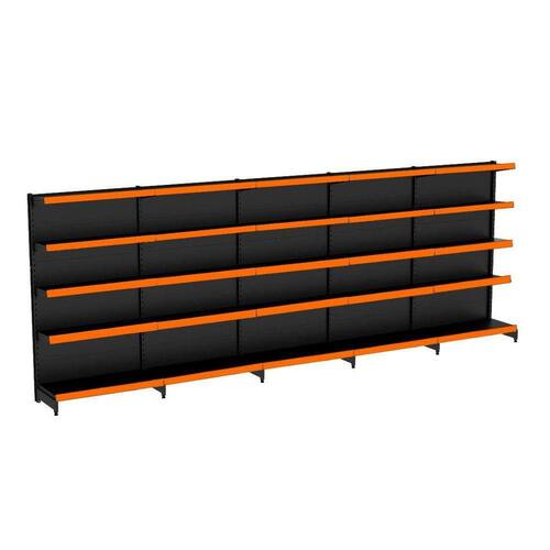 GONDOLA PAREDE 196 AMAPÁ FLEX 60 EXTRA-FORTE KIT 5 METROS 5 BANDEJAS 1X40 CM +4X 35 CM PRETO PORTA ETIQUETA (FAIXA) LARANJA