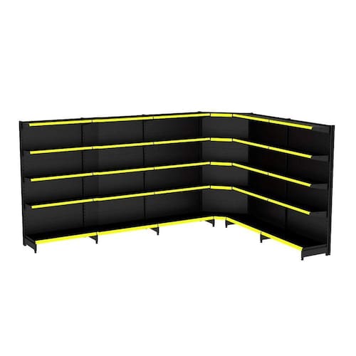 GONDOLA PAREDE 196 AMAPÁ FLEX 60 EXTRA-FORTE KIT 5 METROS COM 1 CANTO 5 BANDEJAS 1X40 CM +4X 35 CM PRETO PORTA ETIQUETA (FAIXA) AMARELO