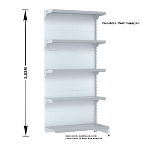A fileira de Gôndolas deve ser iniciada com a Gôndola Inicial que possui 2 colunas. A Gôndola Continuação possui 1 coluna, utilizada para dar continuidade à fileira e não pode ser montada individualmente.