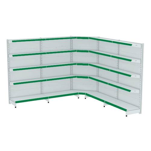 GONDOLA PAREDE 202 FIT AMAPÁ PARA VÃO DE ATÉ 4 METROS MAIS UM CANTO 40/30 BRANCO 25 BANDEJAS PORTA ETIQUETA VERDE