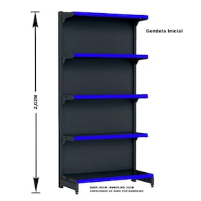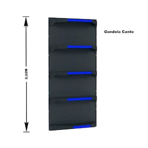 GONDOLA PAREDE 202 FIT AMAPÁ PARA VÃO DE ATÉ 4 METROS MAIS UM CANTO 40/30 PRETO 25 BANDEJAS PORTA ETIQUETA AZUL