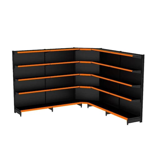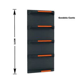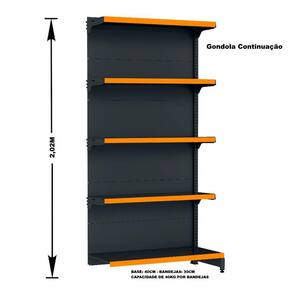 GONDOLA PAREDE 202 FIT AMAPÁ PARA VÃO DE ATÉ 4 METROS MAIS UM CANTO 40/30 PRETO 25 BANDEJAS PORTA ETIQUETA LARANJA