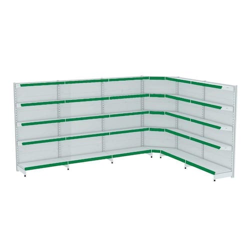 GONDOLA PAREDE 202 FIT AMAPÁ PARA VÃO DE ATÉ 5 METROS MAIS UM CANTO 40/30 BRANCO 30 BANDEJAS PORTA ETIQUETA VERDE