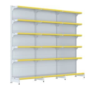 KIT GONDOLA PAREDE 202 CM FIT FARMÁCIA PARA VÃO DE ATÉ 3 METROS 30/25 BRANCO 18 BANDEJAS PORTA ETIQUETA AMARELO