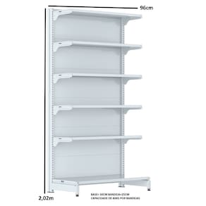 Instruções de Utilização: Para iniciar a montagem da fileira de gôndolas, é essencial utilizar a Gôndola Inicial, que conta com duas colunas. A sequência da estrutura é feita com a Gôndola Continuação, composta por uma coluna, projetada exclusivamente para a ampliação da fileira não podendo ser instalada isoladamente.