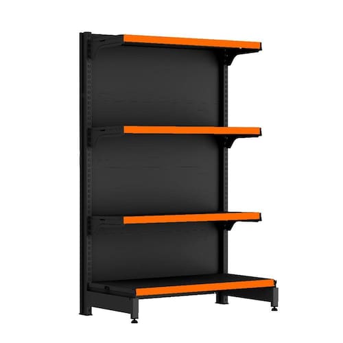 GÔNDOLA PONTA 137 FIT AMAPÁ 40/30 PRETO 4 BANDEJAS PORTA ETIQUETA LARANJA
