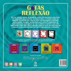 Em um mundo repleto de desafios, todos nós buscamos uma fonte de inspiração para iluminar os nossos dias. A coleção Gotas de Reflexão apresenta uma mescla única de mensagens profundas, curiosidades, imagens fascinantes para colorir e sugestões de exercícios para você aplicar no seu cotidiano e tornar a sua vida mais plena e feliz. São cinco volumes, cada um com um tema que vai conduzir você a uma jornada incrível de descobertas e reflexões! Cada edição traz uma linda pulseira que vem em uma caixinha multiuso para ser usada, por exemplo, como porta-joias ou porta-retratos!