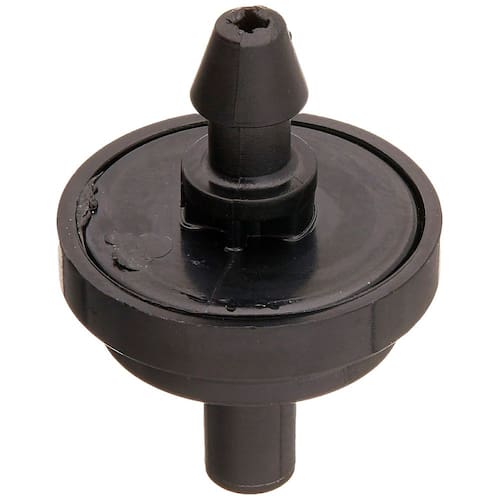 Goteador Raindrip R110CT con compensación de presión de 1 galón por hora (GPH), emisores de riego por goteo para sistemas de jardinería, mantiene un flujo constante de agua. Paquete de 10 unidades, color negro. - EMISOR CON COMPENSACIÓN DE PRESIÓN: Mantiene un flujo constante de 1 GPH incluso cuando la presión del agua cambia. - CÓMO INSTALAR: Se conecta al extremo de una línea de alimentación de 1/4 pulg. o se perfora directamente en tubería de suministro de 1/2 pulg. - USO PARA RIEGO DE VARIAS ÁREAS: Ideal para arbustos y árboles individuales en jardines, así como para plantas en macetas y canastas colgantes. - AUTOLIMPIANTE: El emisor cuenta con un diseño de flujo turbulento que elimina sedimentos para reducir obstrucciones. - CODIFICADO POR COLOR: Incluye diez goteros con compensación de presión de 1 GPH; codificados por color para identificar fácilmente la tasa de flujo: rojo – 1/2 GPH, ideal para suelos pesados/arcillosos; negro – 1 GPH, ideal para suelos medios/franco; verde – 2 GPH, ideal para suelos arenosos.