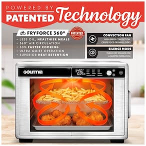 O Gourmia GTF3588S é um forno elétrico de bancada com portas francesas e capacidade aproximada de 35 litros (37 QT), projetado para funcionar como air fryer, forno de convecção e torradeira em um único equipamento. A cavidade comporta refeições familiares em assadeiras, pizzas de cerca de 33 cm e até 9 fatias de pão por ciclo. O sistema FryForce 360 utiliza circulação de ar quente com potência de 1700W, permitindo dourar e crocantar alimentos com pouco ou nenhum óleo.