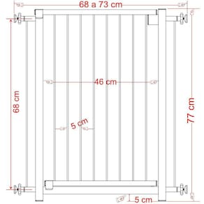 A grade portão possui uma altura de 77 cm, o que proporciona uma barreira eficaz para evitar que seu pet ou bebê ultrapassem. O espaçamento entre as varetas da grade é de 5 cm, impedindo que crianças ou animais pequenos passem através dela.