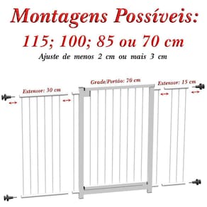 MULTIGRADE - GRADE PORTÃO + 1 EXTENSOR 30 CM + 1 EXTENSOR 15 CM + KIT FIXAÇÃO - MULTIFORMACor: BRANCO- Montagens possíveis: 70 cm; 85 cm; 1,00m ou 1,15 m considerar regulagem de 2 cm para menos e 3 cm para mais controlado pelo conjunto de fixação - Altura do portão: 77 cm- Espaçamento entre varetas da grade: 5cm- Distancia da travessa inferior: 5 cm- Estrutura tubular fabricada em aço com aplicação de pintura epóxi, para aumentar a durabilidade- Sua instalação dispensa o uso de ferramentas ou furos para fixação- O sistema de travamento por pressão impede sua abertura por crianças ou animais, separando os ambientes- Quando acionado, permite abertura completa da grade para ambos os lados- Seu sistema de passagem mais amplo e travessa em altura reduzida, facilitam a passagem mesmo para pessoas com alguma dificuldade de locomoção.Composição do Produto:- 1 Grade Portão de 68 cm- 1 Extensor de 15 cm- 1 Extensor de 30 cm- 4 conjunto de parafusos + manípulos + buchas para fixaçãoObservação:- nunca utilize este produto ou qualquer outro similar como grade de proteção ou segurança em escada, janela ou similar- Sua função é exclusivamente como Separador de Ambientes.A MULTIFORMA produz MULTIGRADE para vão de 70 cm até 1,50 m que podem ser fixadas sem necessidade de furos e/ou ferramentas, nas cores Branco, Preto, Prata, Azul, Rosa e Cobre lançamento