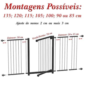 Multigrade - grade portão + 1 extensor 30 cm + 1 extensor 20 cm + 1 extensor 15 cm + kit fixação - multiformaCor: preto- montagens possíveis: 70 cm; 85 cm; 90 cm; 1,00m 1,20m ou 1,35 m considerar regulagem de 2 cm para menos e 3 cm para mais controlado pelo conjunto de fixação - altura do portão: 77 cm- espaçamento entre varetas da grade: 5cm- distancia da travessa inferior: 5 cm- estrutura tubular fabricada em aço com aplicação de pintura epóxi, para aumentar a durabilidade- sua instalação dispensa o uso de ferramentas ou furos para fixação- o sistema de travamento por pressão impede sua abertura por crianças ou animais, separando os ambientes- quando acionado, permite abertura completa da grade para ambos os lados- seu sistema de passagem mais amplo e travessa em altura reduzida, facilitam a passagem mesmo para pessoas com alguma dificuldade de locomoção.Composição do produto:- 1 grade portão de 68 cm- 1 extensor de 15 cm- 1 extensor de 20 cm- 1 extensor de 30 cm- 4 conjunto de parafusos + manípulos + buchas para fixaçãoObservação:- nunca utilize este produto ou qualquer outro similar como grade de proteção ou segurança em escada, janela ou similar- sua função é exclusivamente como separador de ambientes.A multiforma produz multigrade para vão de 70 cm até 1,50 m que podem ser fixadas sem necessidade de furos e/ou ferramentas, nas cores branco, preto, prata, azul, rosa e cobre lançamento