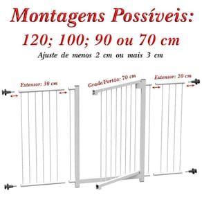 - montagens possíveis: 70 cm; 90 cm; 1,00m ou 1,20 m considerar regulagem de 2 cm para menos e 3 cm para mais controlado pelo conjunto de fixação - altura do portão: 77 cm - espaçamento entre varetas da grade: 5cm - distancia da travessa inferior: 5 cm