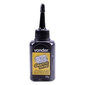 Grafite Em Pó Vonder Grafite em pó que lubrifica e desengripa a seco Isento De Óleo . Ideal Para Roscas Expostas, Cadeados, Correntes, Fechaduras. Conteúdo da Embalagem: 1 Bisnaga com 25g Especificações: - Marca: Vonder - Grafite Em Pó 25 Gramas - Lubrificante De Uso Geral - Para Canaletas De Vidros, Cadeados, Fechaduras, Etc. - Peso Bruto: 40 G Ean: 7893946039455