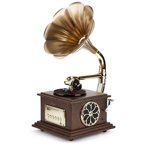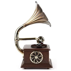 Vintage e design de moda chifre de cobre puro com base de liga de alumínio, revestimento anti oxidação na superfície, requintado e elegante. Efeito profissional 2 alto falantes estéreo de gama completa de 15W integrados à esquerda e à direita. Um alto falante de seda de 10w na parte superior. Mini, mas versátil plataforma giratória de duas velocidades 33, 45 RPM reproduz todos os seus discos de vinil 17,25 e 30 centímetros e álbuns favoritos Conexão Bluetooth para reproduzir música sem fio de seu dispositivo habilitado para Bluetooth smartphones, tablets, laptops, computadores, etc. Conexão de áudio de 3, Rádio FM Saída auxiliar Reprodução USB. Ocasião ser em hotéis, clubes, bares, salas de ioga, decorações de casa ou escritório, ou coleções de souvenirs, ou presentes de feriado de Natal, pode se tornar a peça central e adicionar brilho a qualquer cômodo da casa. Tamanho L x L x A x x 20x15x33 centimetros, peso cerca de 2,5 kg, tamanho da embalagem C x L x A 245200 310mm.22x17x30 centimetros Marca: Não Informado