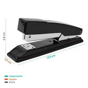 Capacidade: 50 grampos (26/6 e 24/6) Capacidade de Grampeamento: Até 30 folhas Cor: Preto Materiais: Corpo metálico e resinas termoplásticas Dimensões: Altura: 3,6 cm Largura: 6,2 cm Comnto: 13,6 cm