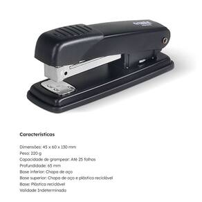 Produzido a partir de tecnologia moderna e matéria-prima de qualidade, possui capacidade para grampear até 25 folhas, ocorrendo variações de acordo com a gramatura do papel ou do grampo escolhido.