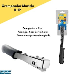 - Marca: Rapid - Modelo: Grampeador Martelo - Referência: R-19 - para todo tipo de trabalho leve. - ideal para têxteis e papel. - trava de segurança integrada. - utiliza grampos finos de 4 a 6 mm. - empunhadura ergonômica em borracha. - sem partes soltas, evitando perda de peças. - peças de reposição disponíveis. - Dimensões: 02 x 03 x 29 cm L x A x P Marca: Não Informado Ean: 7313467260027