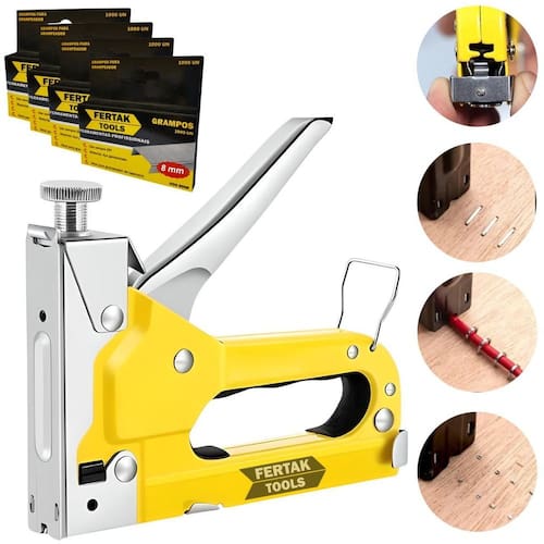 Grampeador Pinador Manual Profissional 3 em 1 Pressão Grampos T-U-Reto 4 - 14mm Fertak Leve e fácil de manusear o Grampeador da Fertak oferece a você ampla aplicação pois aceita grampos nos formatos T, U e Reto. Além de sistema de recarga fácil o grampeador dispõe de corpo em aço reforçado, gatilho de acionamento superleve, suporte para mão emborrachado com ótimo encaixe para os dedos, proporcionando maior conforto durante o manuseio, trava do gatilho para maior segurança, removedor de grampos embutido ao corpo, pino que permite ajuste de perfuração e excelente precisão, garantindo resultados de ótima qualidade. CARACTERÍSTICAS - Possui função Pinador - Removedor de grampos integrado - Ajuste de perfuração - Sitema anti-trava para os grampos - Proteção em Borracha Interna para a Mão - Design ergonômico reduzindo a fadiga do usuário APLICAÇÃO Tapeçaria, estofados, decorações, molduras e outros. Ideal para fixação de materiais em madeira, tais como, tecido, plástico, papel, fixação de forros, telas mosquiteiros , fixação de cartazes escolas, supermercados, etc. , serigrafia, vitrinismo, marcenaria, cartonagem, entre outros. FICHA TÉCNICA Tipo de Grampeador: Manual Profissional Material: Aço Carbono Compatibilidade: Grampo Reto 4 - 14mm 5/32 - 9/16 Grampo U: 10 - 12mm 3/8 - 1/2 Grampo T: 10 - 14mm 3/8 - 9/16 Ajuste : Sim Marca: Fertak ITENS INCLUSOS 01 Grampeador 3 em 1 Profissional 100 Grampos retos 6mm 4100 Grampos retos 8mm SOBRE A FERTAK A Fertak, fundada em 2010 no Espírito Santo, é uma empresa líder na importação e distribuição de ferramentas manuais no Brasil, com foco em atendimento excepcional e qualidade dos produtos. Busca continuamente e mantém o alto padrão de atendimento, qualidade nos produtos oferecidos e ética com seus parceiros.