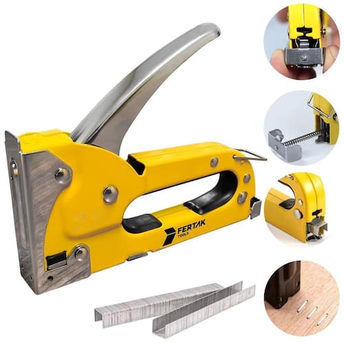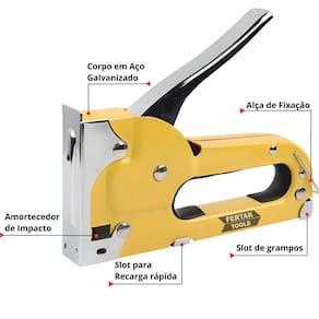 Grampeador Manual Tapeceiro Madeira Pressão Grampos 4 - 8mm Fertak Leve e fácil de manusear o Grampeador da Fertak oferece a você ampla aplicação pois aceita grampos no formato Reto de 4 - 8mm. Além de sistema de recarga fácil o grampeador dispõe de corpo em aço reforçado, gatilho de acionamento superleve, suporte para mão emborrachado com ótimo encaixe para os dedos, proporcionando maior conforto durante o manuseio, trava do gatilho para maior segurança, removedor de grampos embutido ao corpo, pino que permite ajuste de perfuração e excelente precisão, garantindo resultados de ótima qualidade. CARACTERÍSTICAS - Removedor de grampos integrado - Sitema anti-trava para os grampos - Proteção em Borracha Interna para a Mão - Design ergonômico reduzindo a fadiga do usuário FICHA TÉCNICA Tipo de Grampeador: Manual Profissional Material: Aço Carbono Compatibilidade: Grampos Retos 4 - 8mm Marca: Fertak ITENS INCLUSOS 01 Grampeador Manual 100 Grampos de 8mm SOBRE A FERTAK A Fertak, fundada em 2010 no Espírito Santo, é uma empresa líder na importação e distribuição de ferramentas manuais no Brasil, com foco em atendimento excepcional e qualidade dos produtos. Busca continuamente e mantém o alto padrão de atendimento, qualidade nos produtos oferecidos e ética com seus parceiros. Marca: Não Informado