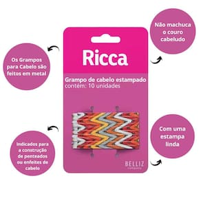Os Grampos para Cabelo Ricca são feitos em metal e possuem proteção nas pontas para não machucar o couro cabeludo. São indicados para a construção de penteados. Com uma estampa linda.