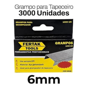 Kit 3000 Peças Grampo 6mm Fertak O Kit com 3000 Grampos 6mm Fertak é ideal para uso em grampeadores manuais ou elétricos, oferecendo alta durabilidade e eficiência em diversos tipos de trabalhos. Indicado para fixação de papéis, tecidos, plásticos, couro, forros, estofados e muito mais.