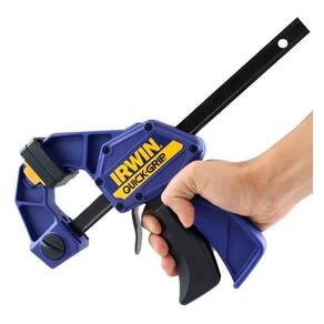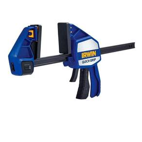 Grampo rápido heavy duty 45cm 18'' irwin Grampo rápido quick-grip® heavy-duty 18 (45 cm); Novo botão quick-change(tm) converte facilmente o grampo em um expansor; Novas mandíbulas rotativas e removíveis; gatilho quick-releasetm que possibilita liberação do grampo com apenas uma mão; barra em formato "i" que aumenta a força de pressão e reduz torção e flexão; Apoio ajustável que proporciona suporte adicional para o grampo ficar equilibrado sobre a superfície de trabalho; Profundidade da garganta de 92mm; Converte para expansor; Almofadas protetoras removíveis; sustenta 600 lbs (272 kg) de pressão de aperto. Linha - quick grip Tipo - heavy duty Medidas - 18'' Atributos - sustenta 600 lbs (272 kg) de pressão de aperto Material - poliamida e aço Uso indicado - indicado para segurar ou apertar objetos para serem trabalhados, como para fazer acabamentos, cortar, serrar, lixar ou até mesmo fixação para secagem. Tipo de usuário - marceneiros, carpinteiros, serralheiros, artesãos e demais profissionais que trabalham com acabamento em madeira ou necessitem fixar objetos de forma rápida e resistente.