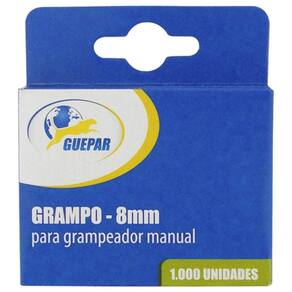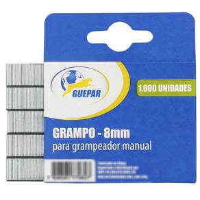 Grampo Reto para Grampeador Tapeceiro 8mm Caixa 1.000 Un Guepar - Marca: Guepar - Referência: 861-2103 - Altura do grampo: 8 mm - Largura do grampo: 11,4 mm - Caixa com 1.000 grampos - Material do grampo: aço carbono - Tipo do grampo: reto - Possui acabamento zincado, proporcionando maior resistência à oxidação/corrosão - : 90 dias Marca: Não Informado